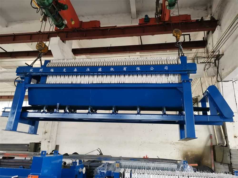 隔膜壓濾機和常規箱式壓濾機的主要區別在于,在濾板的兩側都增加了兩個彈性膜(復合橡膠膜是一個整體式膜。在操作期間,當進料完成時,將高壓流體介質注入膜中,并使整個膜膨脹以過濾濾餅,以進一步使濾餅脫水,這是壓力過濾。在隔膜壓濾機運行期間,液壓系統使用液壓油作為壓力載體來傳遞內部壓力。